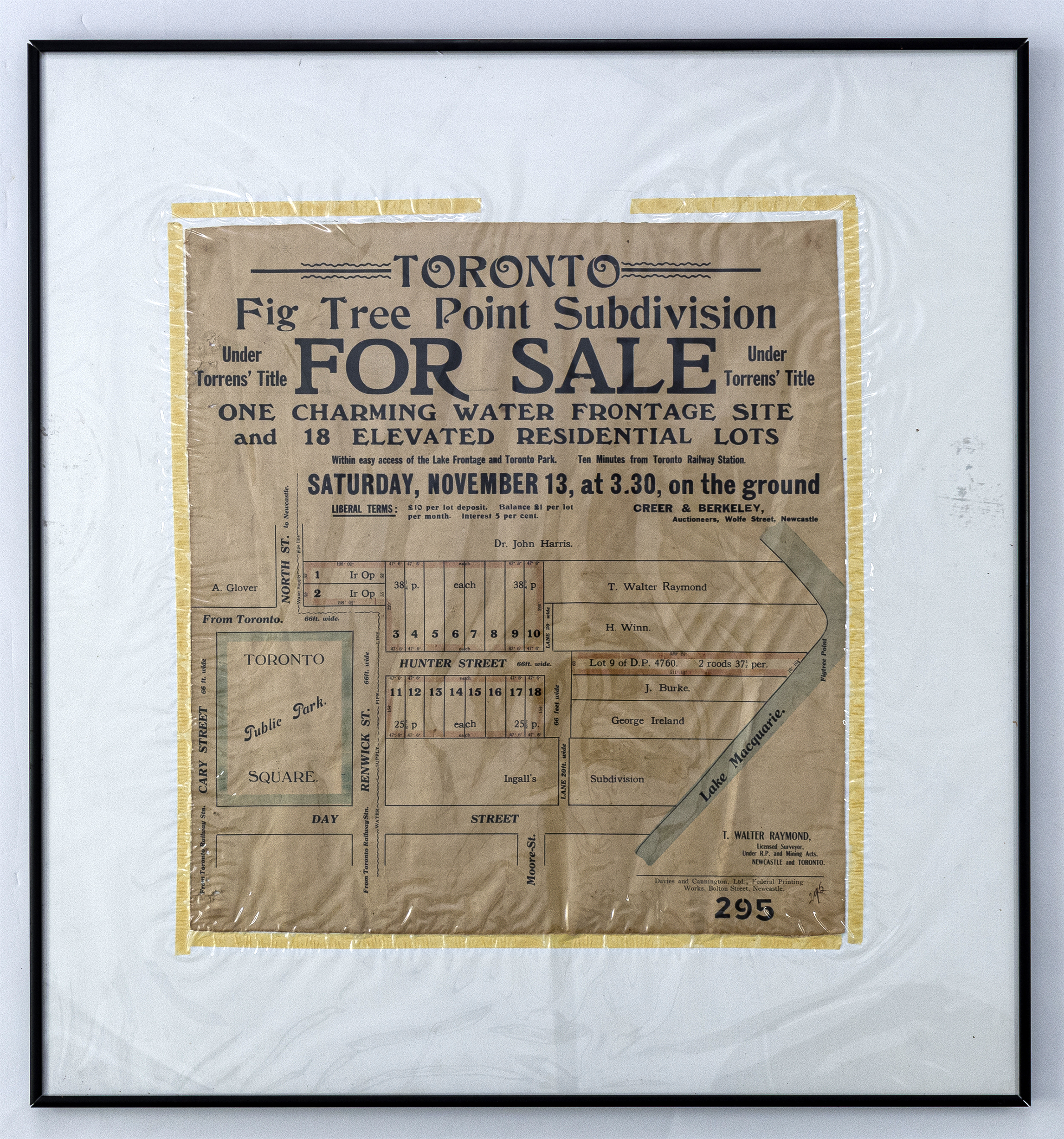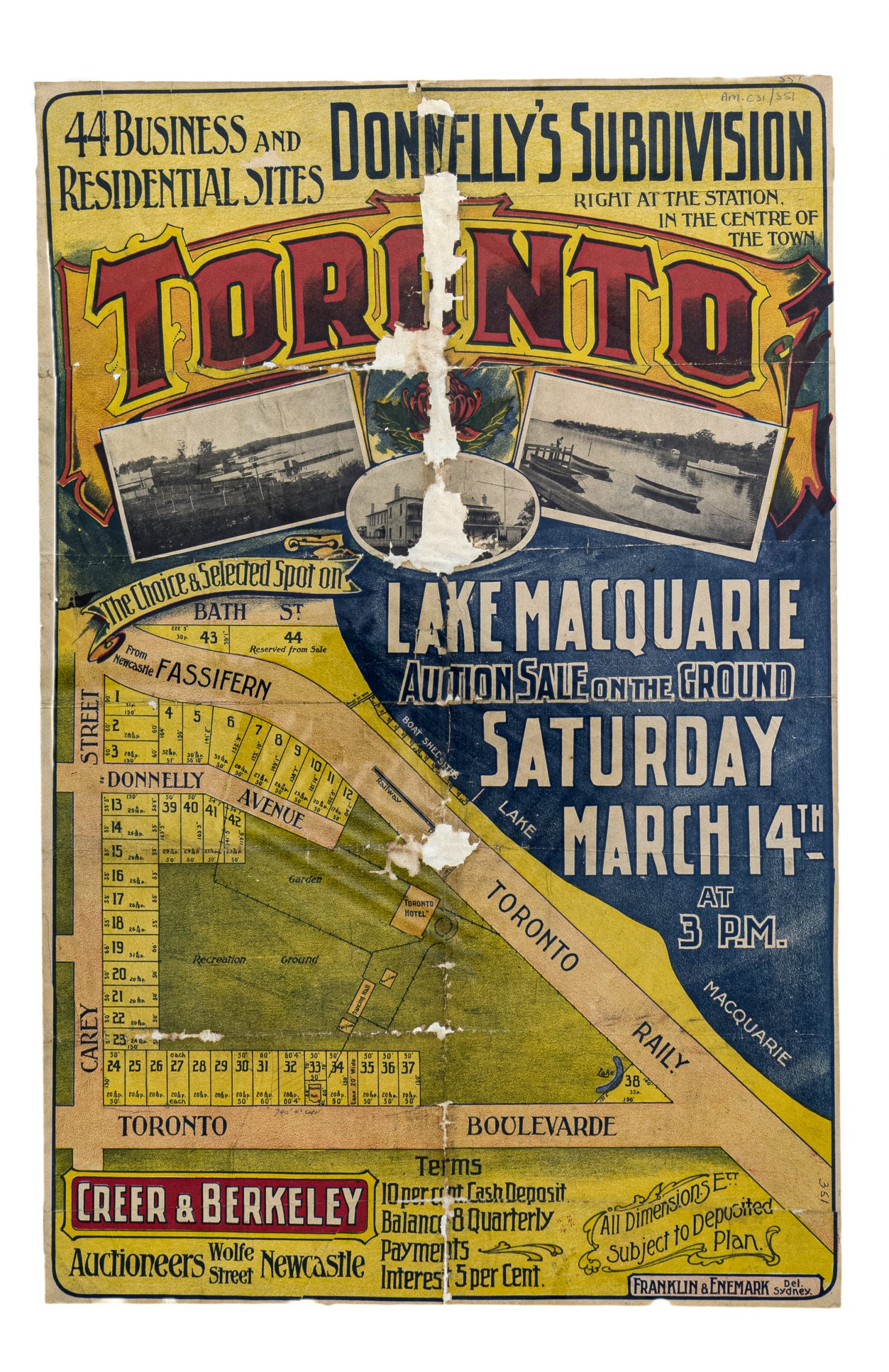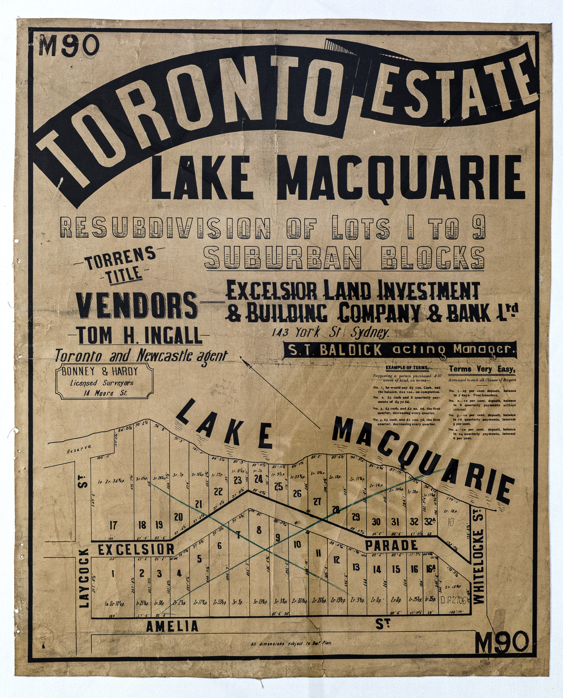 Drawn up in 1901, 1914 and 1920, these land subdivision sale posters from Toronto, Lake Macquarie, illustrate small pieces of what was essentially an enormous jigsaw puzzle. Named the Toronto Estate, the ‘puzzle’ had been created in 1885-7, when the attractive lakeside land was first divided and auctioned by the Excelsior Land Investment and Building Company.