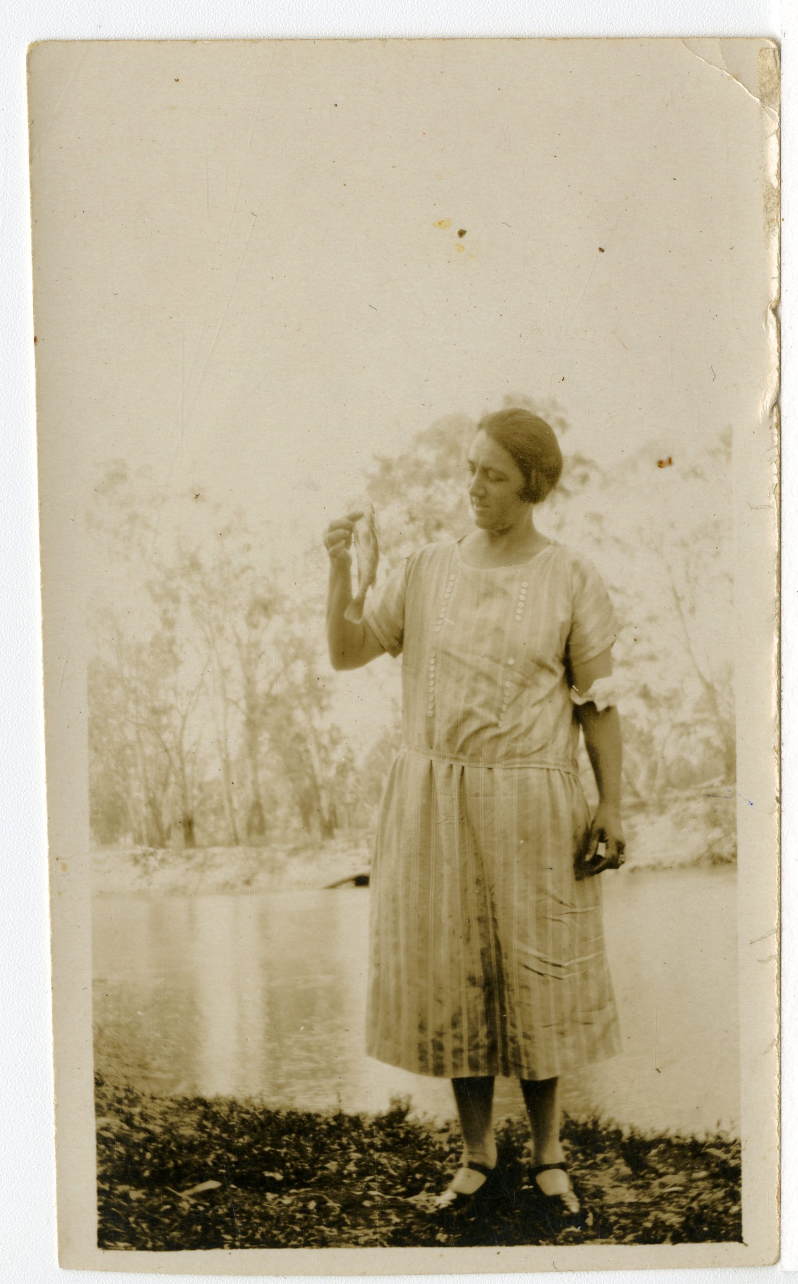 This photograph of Esther was taken on the banks of the Murray River at Howlong, on Bpangerang and Wiradjuri country. The ring on her left hand suggests that this photo was taken sometime after her marriage in 1911. The Arnold family were regular visitors to the river which would have been a welcome break from their busy lives.