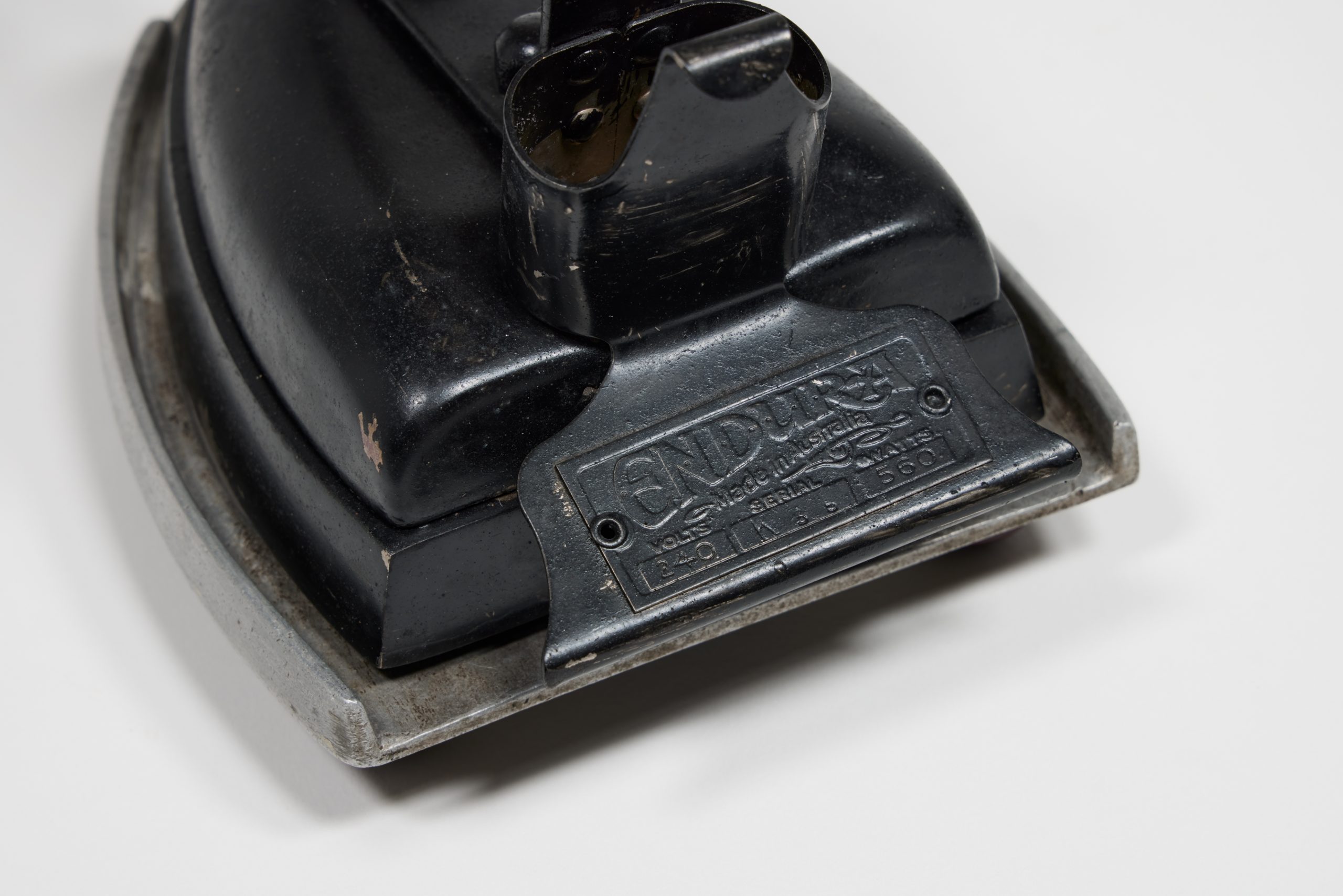 The ‘Endura’ model electric iron pictured probably dates from the 1930-40s. The triangular tail piece at one end was a resting support but it may not have been needed thanks to the accompanying trivet. The small circular concave element attached to the front of the handle was a thumb rest which allowed the ironer to press down firmly. The day this iron was purchased and brought home was surely a happy event for the ironer of the household.