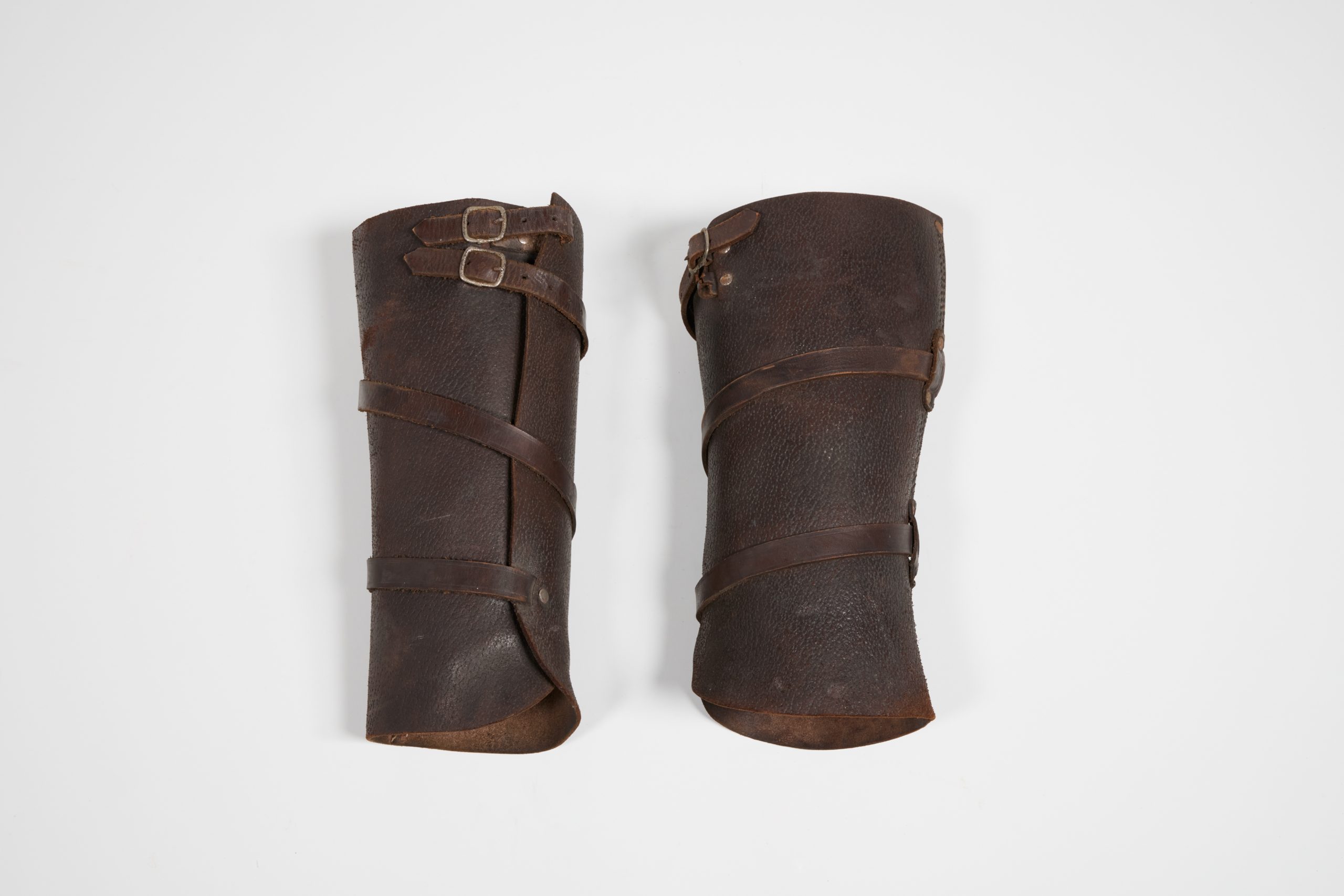 Gaiters protected the legs of horse riders from chaffing against the saddle, stirrups or stirrup straps, as the horse moved. The straps that spiral from the base to the top of the gaiter have a buckle at either end of the strap. Tightening the strap tightens the fit of the gaiter, and the buckle stops the strap from loosening. They looked smart too.