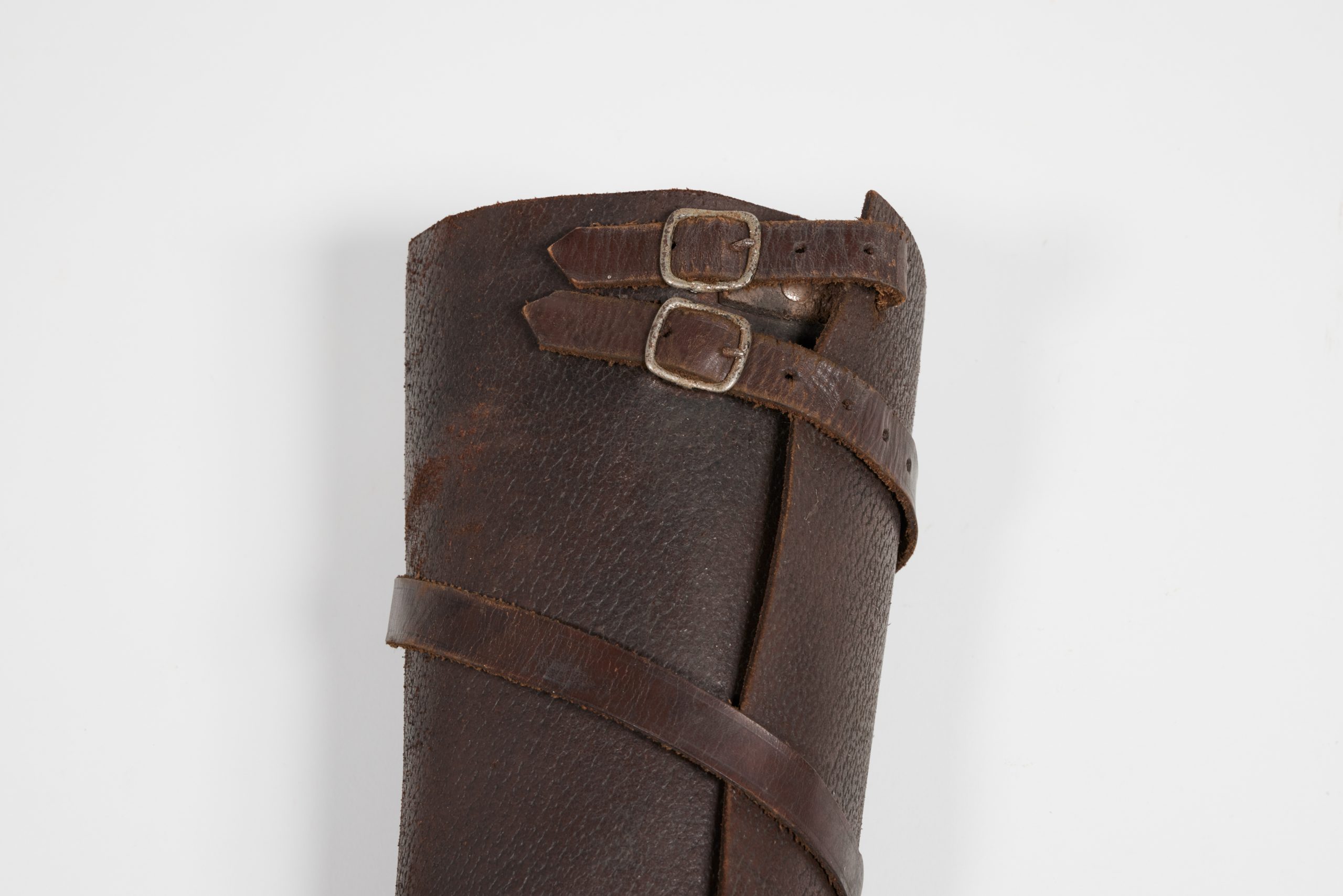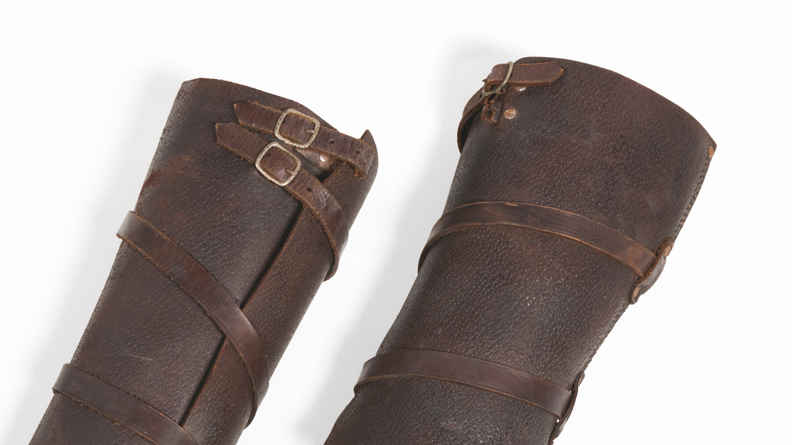 Stowasser gaiters were usually made of cowhide or pigskin leather. The dimpled surface of this pair suggests they are pigskin gaiters, which were considered to be of higher quality than those made from cowhide.